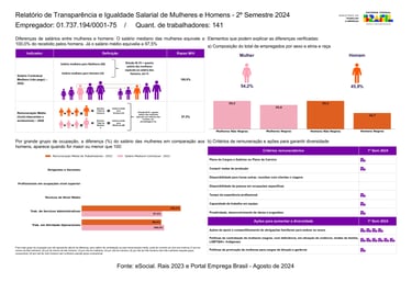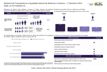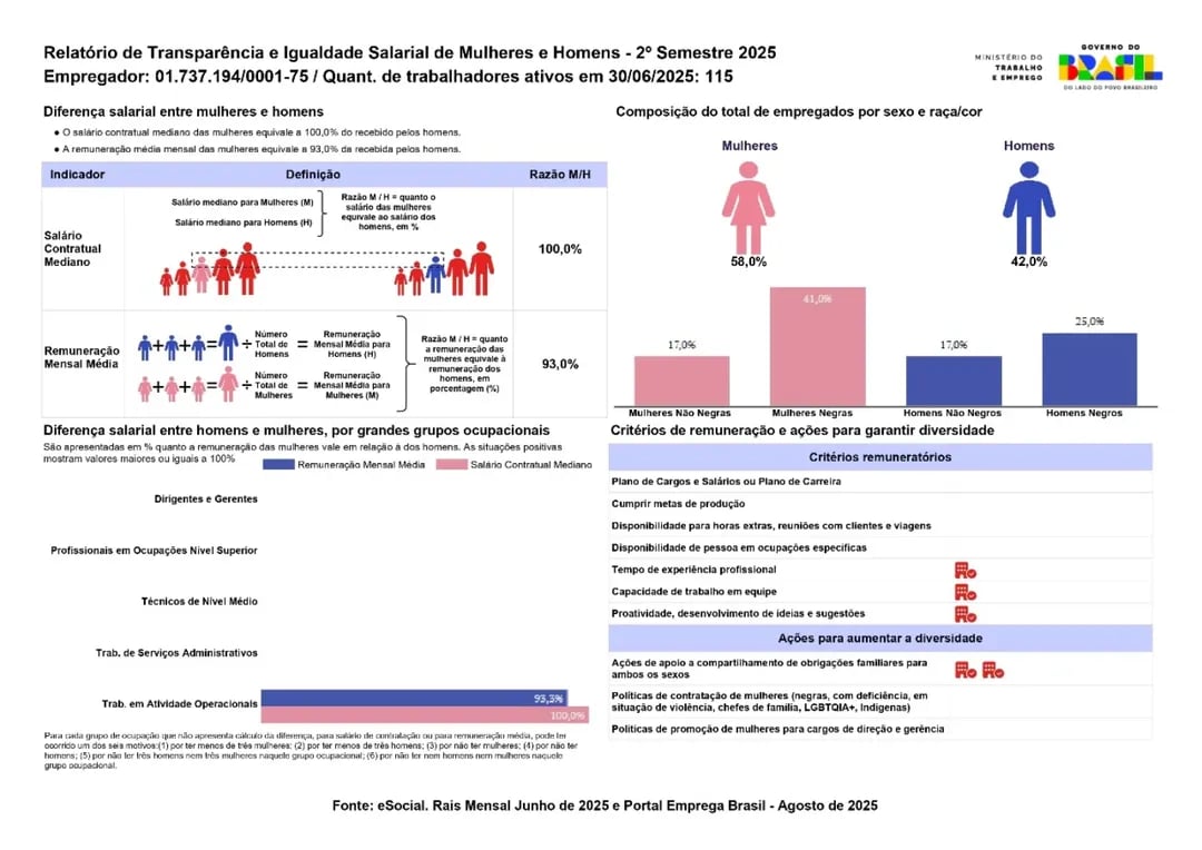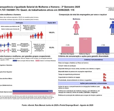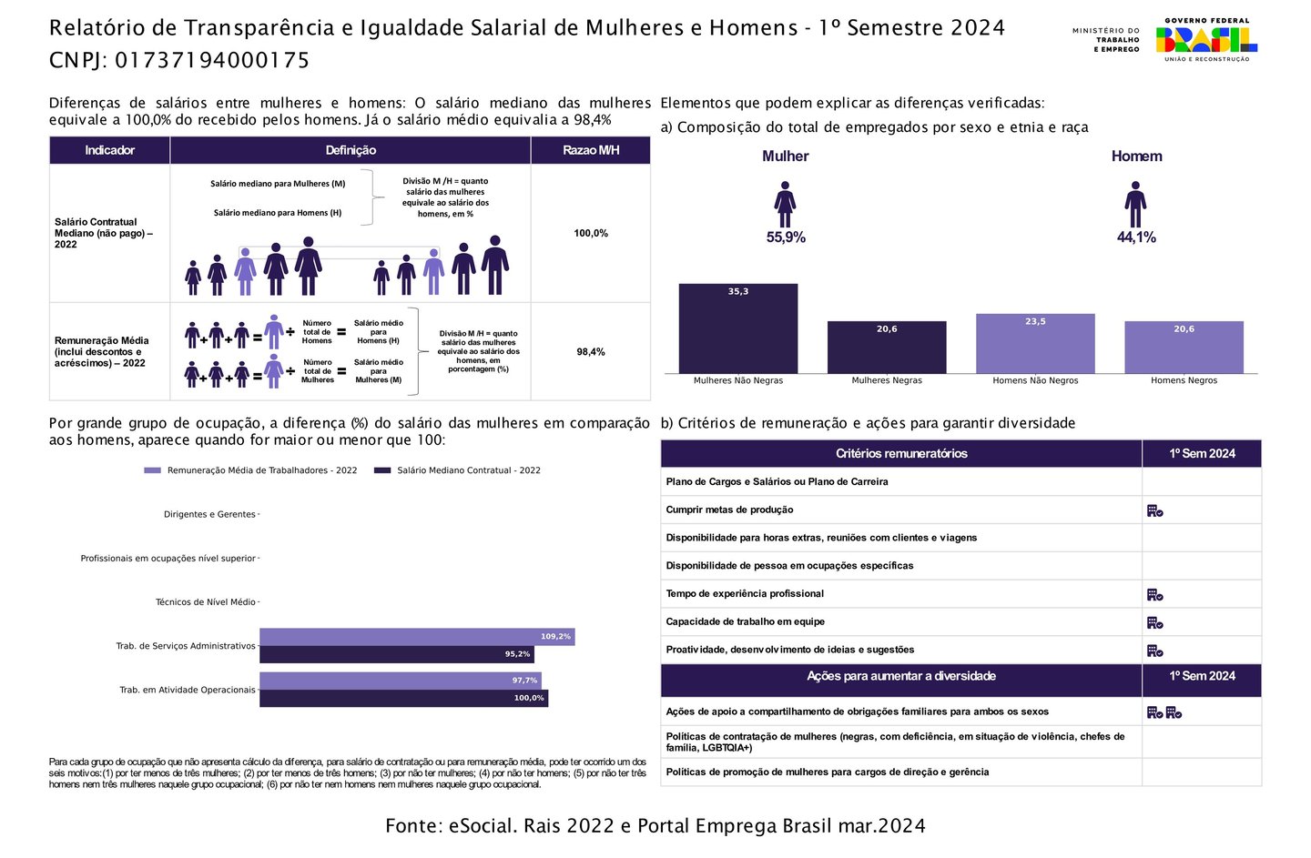 O Relatório do Ministério do Trabalho e Emprego (MTE), aqui publicado, foi elaborado conforme a metodologia oficial do órgão e reflete a remuneração de homens e mulheres em nossa operação. Em virtude de nosso estabelecimento superar o quadro de 100 empregados, apresentamos este relatório em total conformidade com as exigências da Lei 14.611 de 2023.